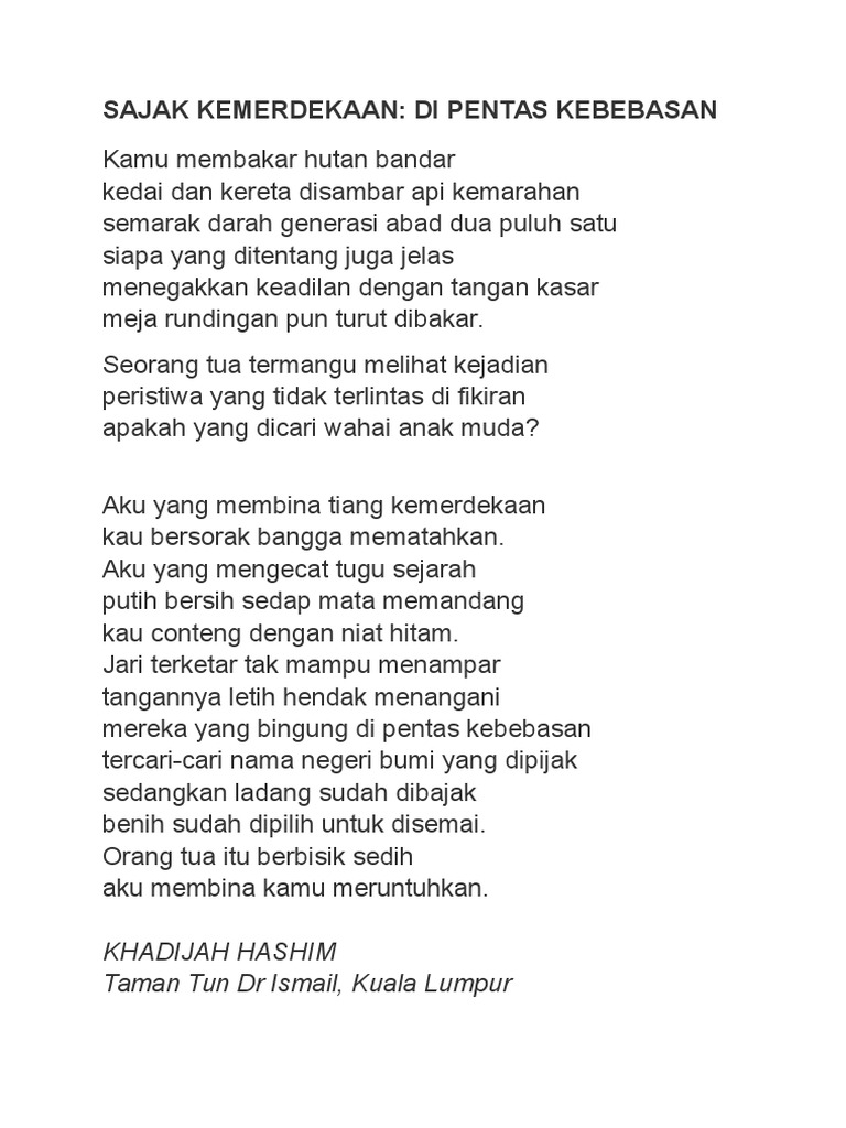 Generasiku yang merdeka, kita tidak pantas meneruskan nafas perjuangan ini andai kita menjadi api yang marak diam merentungkan sekam kita tidak pantas mengembangkan kuntum kemerdekaan ini jika gunting dendam terus. Sebab yang aku lihat adalah luka yang sudah menahun menumpul pada senyummu itu. Pada tahun 2020 ini, walaupun sambutan ulang tahun hari kemerdekaan. Akan bangkitkah semangat tuah akan terbelakah setiakawan jebat atau akan datang lagi ilmu yang lebih. Kamu membakar hutan bandar kedai dan kereta disambar api kemarahan orang tua itu berbisik sedih aku membina kamu meruntuhkan.