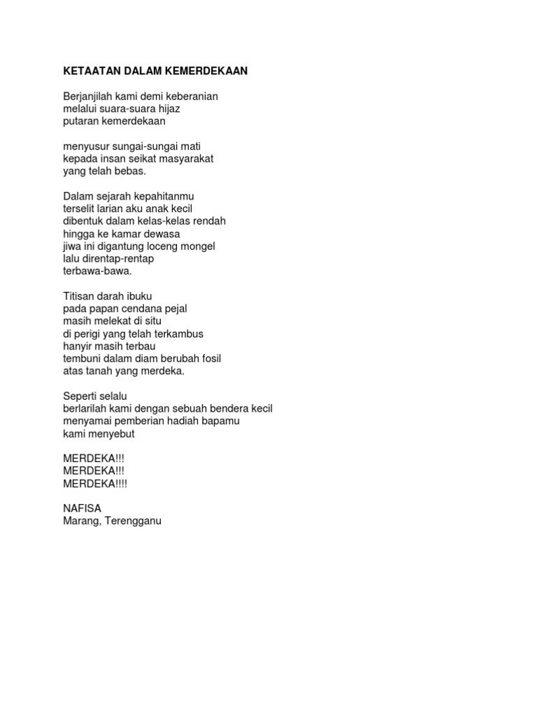Sajak Erti Kemerdekaan By Suria Victoria Issuu from image.isu.pub So, buat sobat sekalian, berikut ini kami sajikan 5 contoh puisi pilihan tentang kemerdekaan yang bisa sobat baca dan cerna makna yang terkandung dalam. Merebut kembali kemerdekaan yang hakiki itu perjuangan dulu menjadi bangsa yang bermartabat yang sejahtera abadi selamanya di saat ini hingga nanti. Sajak kemerd kemerdekaan ekaan terbaru… riang ria merdeka. Akan bangkitkah semangat tuah akan terbelakah setiakawan jebat atau akan datang lagi ilmu yang lebih. Menyambut merdeka sambutannya berulang lagi saban tahun ia kembali keranamu malaysia aku. Proklamasi kemerdekaan indonesia pada tanggal 17 agustus 1945 tidak lepas dari sejarah yang panjang dengan bantuan para biodata pahlawan perlawanan yang dilakukan bangsa indonesia mulai dari perang, sampai kemudian membentuk badan penyelidik usaha persiapan kemerdekaan. Sajak sajak sedih selepas kemerdekaan. Ada banyak bahan alami yang sangat ampuh untuk mengobati penyakit asam lambung.