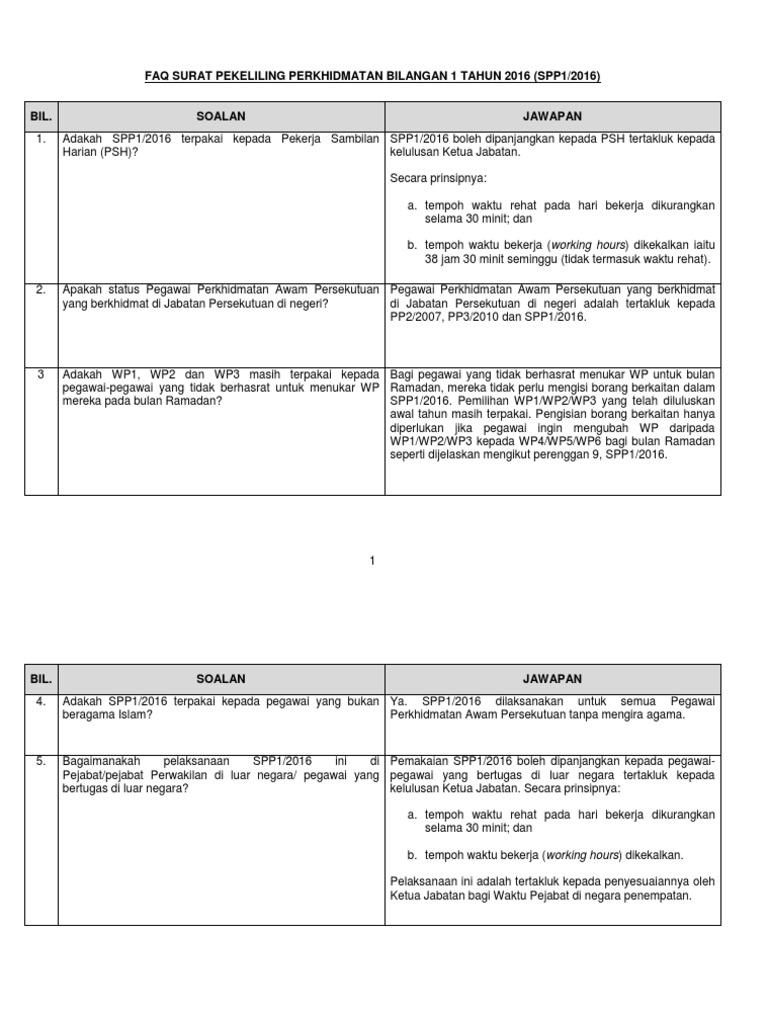 Pindaan kepada surat pekeliling am bil 2 tahun 1982, perenggan 6. Berkenaan waktu bekerja berperingkat(wbb) dilaksanakan khas pada bulan ramadhan. Surat pekeliling perkhidmatan bilangan 1 2016. Pemakaian pekeliling perkhidmatan bilangan 1 tahun 2020. Pengurusan perkhidmatan rangkaian telekomunikasi bersepadu kerajaan (1gov*net).